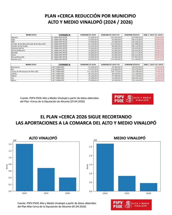 La diputada del PSPV-PSOE en la Diputación de Alicante, Verónica Giménez Vidal, ha denunciado que “el equipo de gobierno del Partido Popular en la Diputación ha reducido el Plan +Cerca para 2026, de los 44 millones de euros en 2023 a los 8,8 millones de este año”.