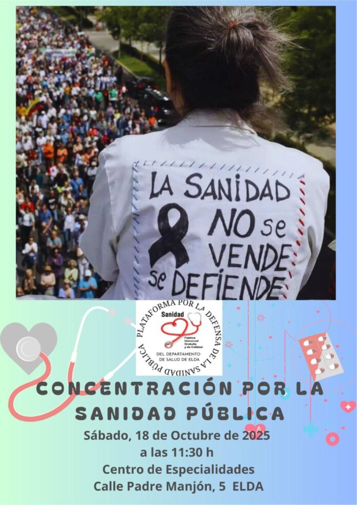 La Plataforma por la Defensa de la Sanidad Pública del Departamento de Salud de Elda ha convocado a la ciudadanía a una nueva concentración, frente al Centro de Especialidades de Elda de la calle Padre Manjón, el sábado día 18 de octubre a las 11:30 horas.