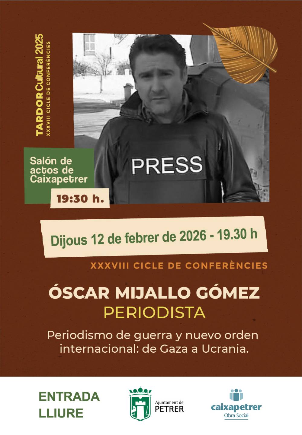 El salón de actos de Caixapetrer acoge, hoy jueves a las 19:30 horas, una conferencia del periodista y corresponsal internacional de TVE, Oscar Mijallo Gómez, que versará sobre “Periodismo de guerra y nuevo orden internacional: de Gaza a Ucrania”.