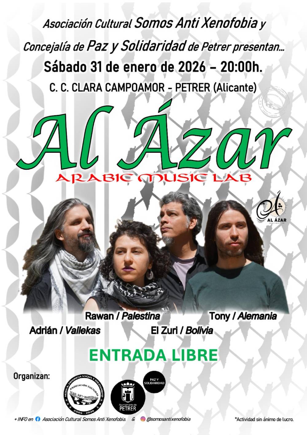 El Centro Municipal “Clara Campoamor” acogerá, el sábado 31 de enero a las 20:00 horas, un concierto del grupo Al Ázar, organizado por la Concejalía Paz y Solidaridad, en colaboración con la Asociación Cultural “Somos Anti Xenofobia”.